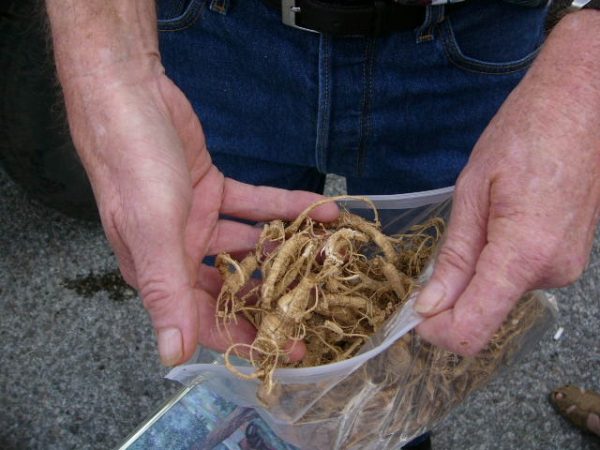 American Ginseng (Panax quinquefolius) is a perennial plant native to Southeastern United States, including the Ozarks. Every year in fall, hunters gather the roots in hopes of turning a day’s labor into tidy profits. Actually, it usually takes more than a day to gather enough roots to make a pound of dried roots to sell. The labor is hard but takes the digger through some of the most beautiful (albeit tick infested) places in our Ozarks. It takes about a bread bag full of fresh, about 300 roots to make about a pound dried. When ginseng was more plentiful in the woods, this might not have taken so long. Nowadays, plants are scattered far and between and it takes a bit of walking to gather even half a bag. That’s why many choose to grow American ginseng on their own property in such a way that the roots are indistinguishable from true wild. It’s called “Virtually Wild” or “Wild-Simulated” ginseng.