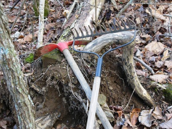 I use the rake to pull leaves away only from the spot I’m planting and the pick for moving rocks or roots out of the spot.
